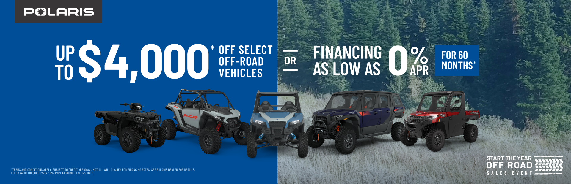 *Rebates available on select new and unregistered 2024 - 2026 Sportsman, Scrambler, RANGER, RZR, GENERAL and Polaris XPEDITION models purchased between 1/1/2026 - 2/28/2026.